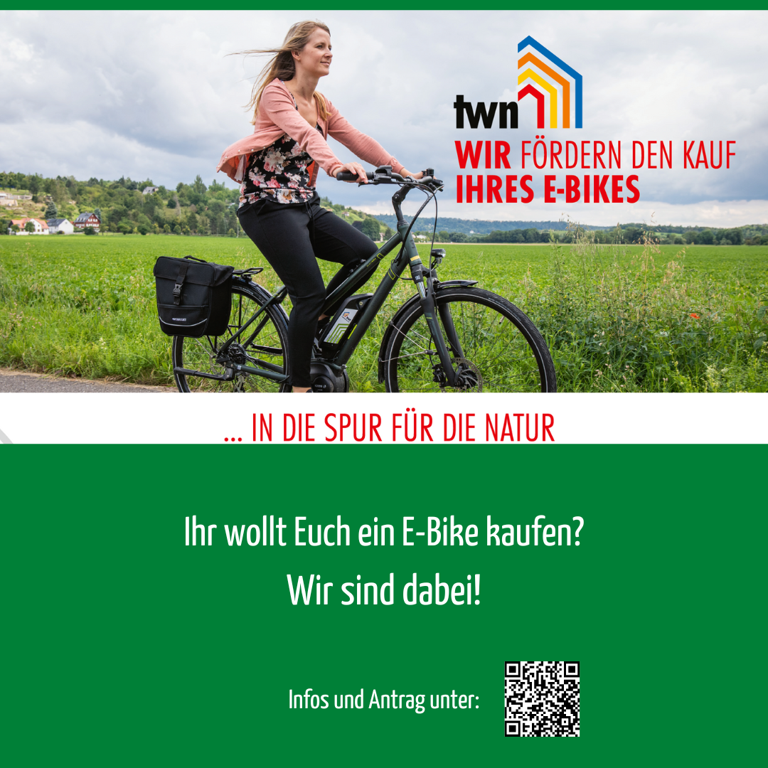 Sie können sich als Käufer eines E-Bikes einen Zuschuss in Höhe von 30 € bei TWN sichern und leisten damit einen Beitrag zum Umwelt -und Klimaschutz.