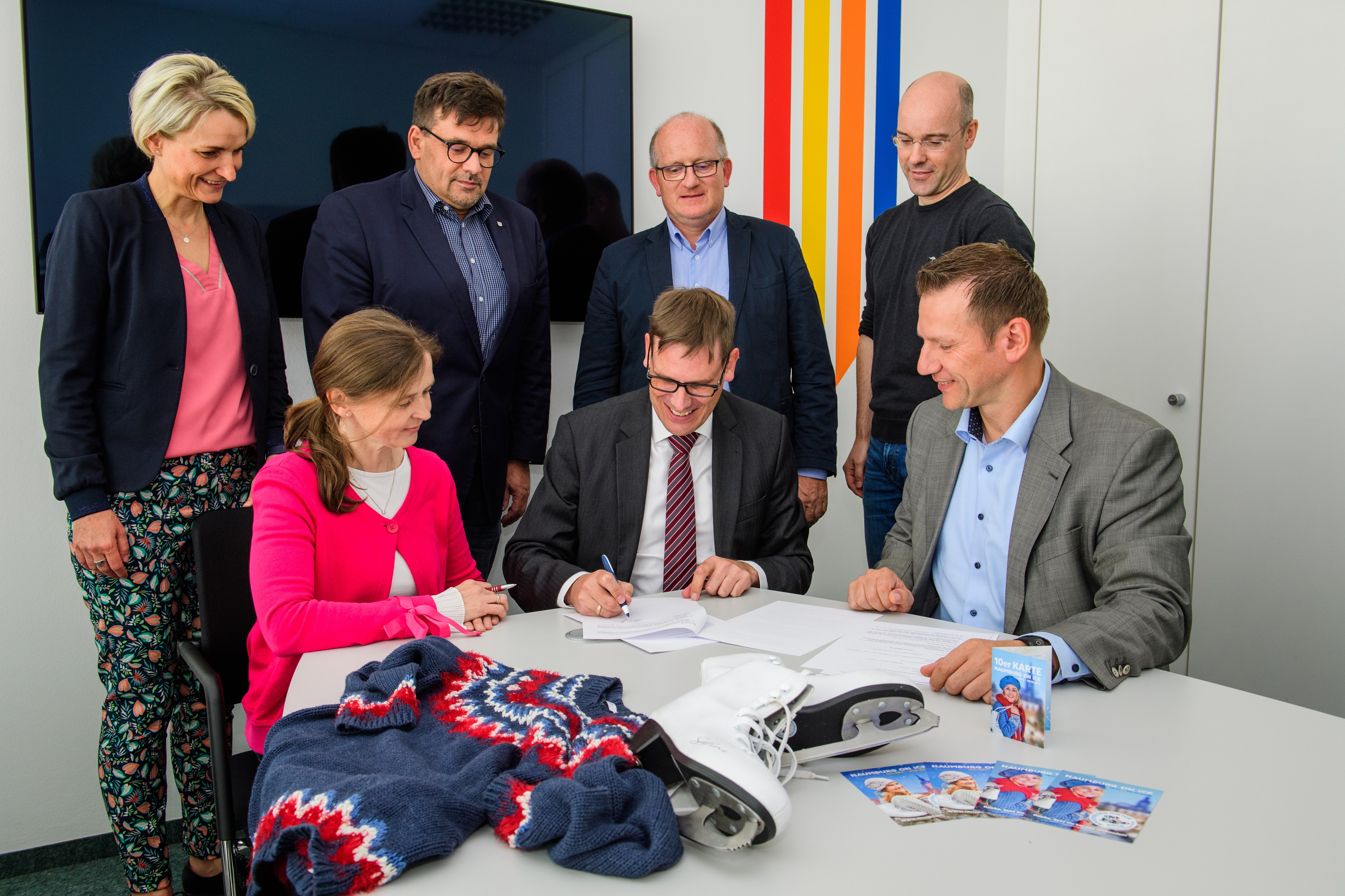 Die TWN, vertreten durch die Geschäftsführer Detlef Apel (vorn Mitte) und Ulrich Klose (hinten, 2. v. rechts), und die Servicegesellschaft Sachsen-Anhalt Süd mit ihrem Geschäftsführer Kay Lehmann (vorn rechts) werden die Eisbahn großzügig finanziell unterstützen. Der Innenstadtverein, vertreten durch Vorsitzende Anke Weiland (vorn links), Vorstand Andreas Hünerbein (hinten rechts) sowie Citymanagerin Sylvia Kühl (hinten links) betreiben das 4. Jahr die Eisbahn in Naumburg. Der stellvertretende Oberbürgermeister Armin Müller (hinten Mitte) sicherte die Unterstützung durch die Stadt zu.